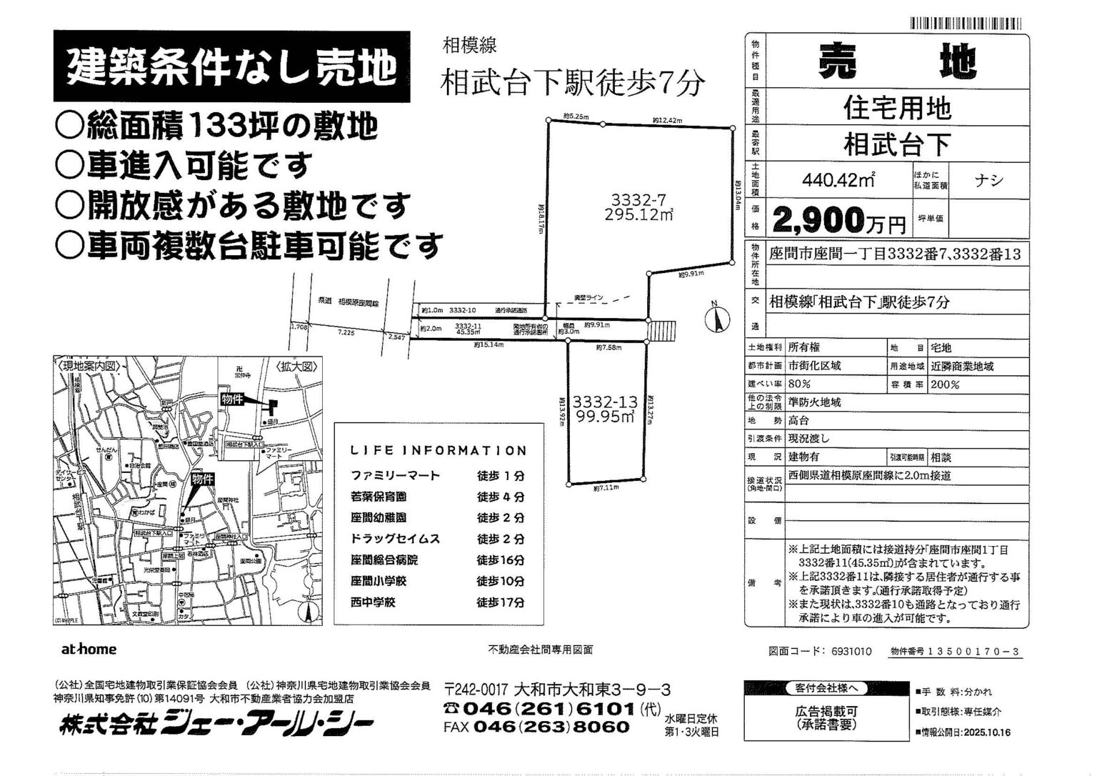 座間市相武台下 建築条件なし売地 2025年10月19日 相模線「相武台下」駅 徒歩7分 総面積133坪! 車進入可能 開放感のある敷地 アパート用地としても可 物件種目:住宅用地 土地面積:440.42㎡ 販売価格:2,900万円 ▼お気軽にお問い合わせください ☎ 046-261-6101 ✉ お問合せフォーム